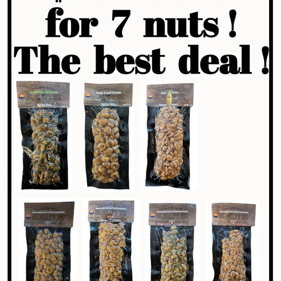 If you want to be satisfied this nut deal gives you a variety of our best selling nuts. 1 big ass toasted corn, 1 big ass spicy dill, 1 barbeque nutlets, 1 garlic hot peanut, 1 en fuego peanut, 1 chili lime peanut and 1 spicy dill peanut. this one you will want to reorder for party's my friend.