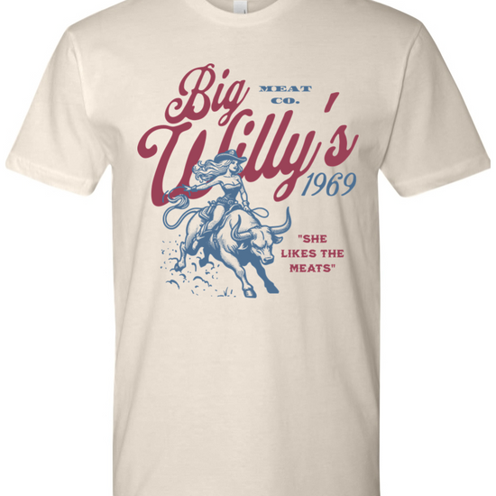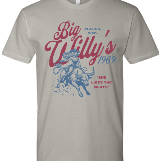 Introducing the Big Willy Meat Co. Graphic Tee, crafted from 100% combed ring-spun cotton/poly for a soft, comfortable fit. This tee features bold, Big Willy themed graphics that celebrate our passion for quality meat. Perfect for fans of Big Willy Meat Co., this shirt lets you wear your love for our jerky with pride. Durable and stylish, it's a must-have addition to your casual wardrobe.